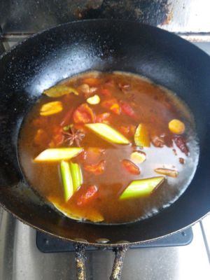 放牛肉裹匀糖色,烹料酒、放葱姜,香料;