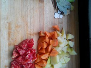 土豆炒出香气后,加一杯水,把番茄丁加入,盖锅熬汁,注意,用中火!熬制过程偶尔翻动下土豆。