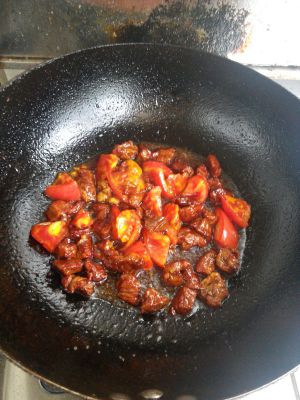 葱段,大料,姜片,干辣椒爆香下牛肉块翻炒,炒均匀加番茄酱,冰糖,生抽翻炒