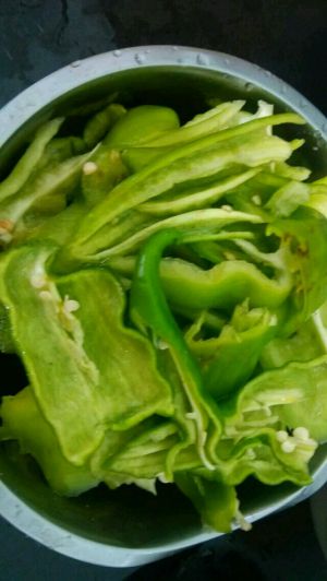 加入菜椒翻炒,菜椒熟的也快,加入后翻炒一下一会变色了就好了。