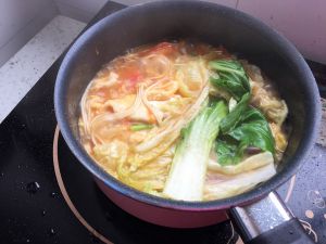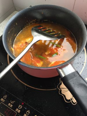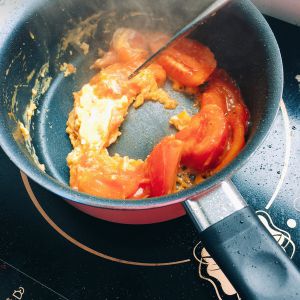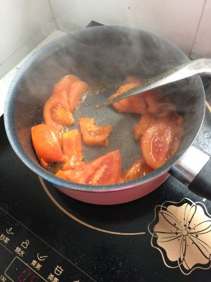 放入适量汤水让番茄汁释放,最后放入面煮开即可。放入葱花