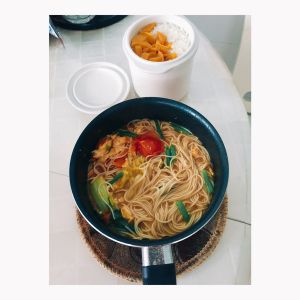 面煮熟后,倒出多余的水,把鸡蛋和西红柿放进去,加热,搅拌,使其融合!