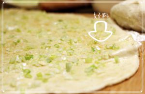 面皮上抹油,油多才香,撒盐,撒葱花。