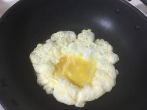 炒锅加油烧热至8成热,大火倒入鸡蛋液快速滑散后盛出备用