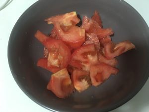 葱花适量。西红柿切丁,切块也凑合,就是炒的时候费点时间了。火腿肠可有可无。