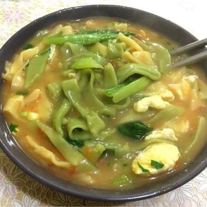 今天用的自己擀的菠菜面和胡萝卜面,汤很浓稠,如果用挂面,汤汁会较稀,不过味道各有千秋