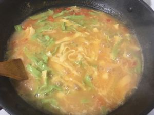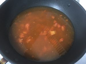 炒成糊状之后加水,热水凉水无所谓,根据个人时间定。加水之后就有了红红的汤,水太多味道就淡了,能没过面条即可。等水开的时候可以去刷个牙,根据我的经验,刷完牙回来水应该就开了。