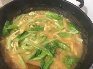 倒入菠菜碎大火煮开后加蛋碎搅匀关火就是面卤