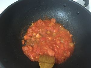 将西红柿倒入炒锅翻炒并压碎,加一勺盐,一勺番茄酱,一勺生抽炒至西红柿出汁,如上图所示状态即可