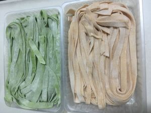 手擀面,今天用的是前一天擀的菠菜面和胡萝卜面,冷冻起来了,吃的时候拿出来解冻一下,不影响口感