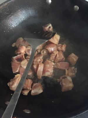 白沙糖下锅,慢慢搅动,直到烧化呈焦黄色飘浮到油面,切记不可变黑,如果黑了那可就有糊味了,严重损伤了大盘鸡的味道……