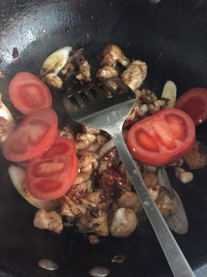 放入辅料一起翻炒,加生抽,盐,鸡精。当番茄炒软之后加开水,再放入土豆一起闷。