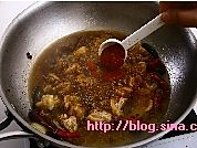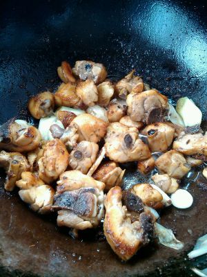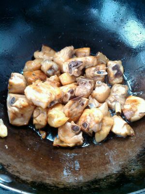加入冰糖,糖化开,起沫时放入鸡块!