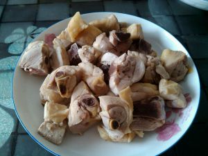 鸡肉切块,锅中烧水加几片姜片,水开后加鸡块煮一分钟左右,去除赃东西和腥味!捞出备用!