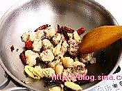 加热炒锅,倒入油,油7成热时,倒入姜片、花椒、大料、桂皮和干辣椒,煸炒出辣味后,倒入鸡块炒2分钟,倒入啤酒炖煮。