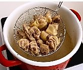 锅中倒入水,大火煮沸后放入鸡块焯烫3分钟捞出,用清水冲净鸡块表面的浮沫,沥干水分。