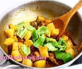 加入葱头块,青红椒块,豆瓣酱翻炒,加盐,鸡精,味精,糖,生抽,老抽适量!焖煮一分钟!