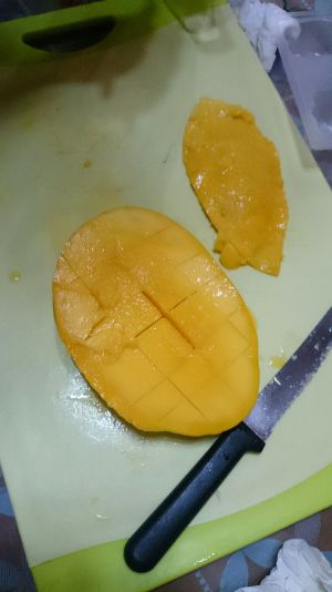 取芒果肉 切成两大半儿 然后横竖划开 翻开 这样比较好取果肉