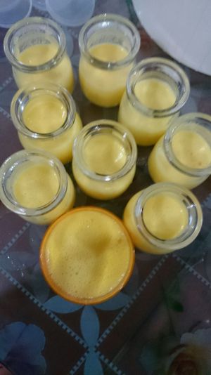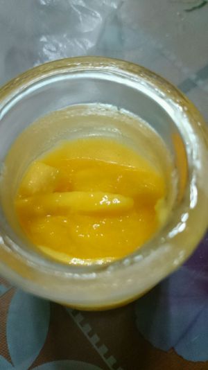 分别倒入瓶中七分满,留点位置放芒果肉。(我懒得洗多个网没过筛所以有泡泡,亲介意泡泡可以过筛)。