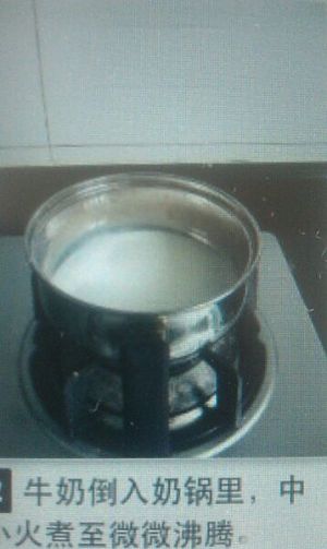 2.牛奶倒入奶锅里,中小火煮至微微沸腾。