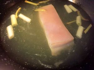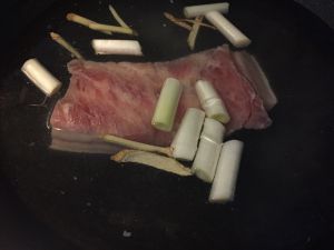 五花肉冷水下锅,加入葱段,姜丝大火烧开