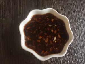 1,蒜头姜等适量,剁成沫放入碗里。放少许糖,盐,十到20g酱油,加入红油(没红油可用辣椒油,花生油代替)。加入煮猪肉的原汤搅拌均匀。酱料制作成功!