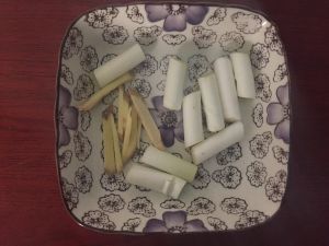 切好的白肉可以直接蘸着料汁吃,也可以卷着黄瓜沾酱汁吃,个人喜欢卷黄瓜的比较不会腻。