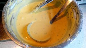 南瓜汁打入鸡蛋,筛入糯米粉,加入芝麻白糖,搅拌均匀。