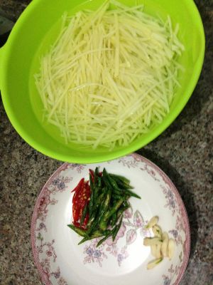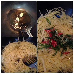 锅中放适量油,放入大蒜炒香,放入土豆丝翻炒,待土豆丝炒软放入调味料和辣椒,翻炒均匀就可以出锅啦!超级的简单有木有。