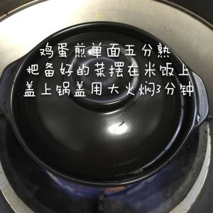 开中火烧石锅 听到滋啦滋啦的声音 闻到饭焦的香味就差不多了 大概5分钟左右 。再把煎好的单面蛋铺在最上面