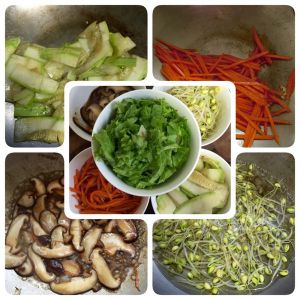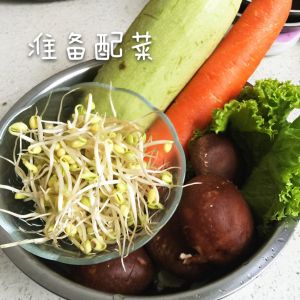 红萝卜炒熟、放少量盐 西葫芦炒熟、放少量盐 香菇和豆芽焯水、放少量盐