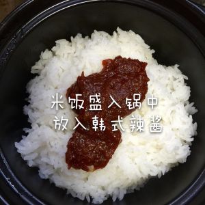 米饭盛入锅中、根据口味放入韩式辣酱。我反正是重口味…