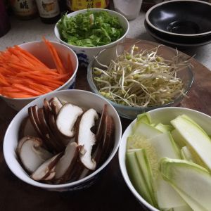 香菇切片,胡萝卜、洋葱、西葫芦切丝,所有配菜和肥牛都炒熟,鸡蛋煎熟
