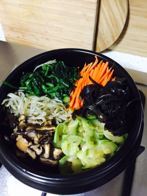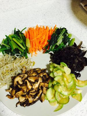 把所有的菜切丝 胡萝卜不需要过水 黑木耳 芹菜 菠菜 豆芽 锅里烧水放点盐 过水烫熟 捞出来 。 香菇 和 西葫芦 就稍微用少许油炒一下 根据自己的口味放调料