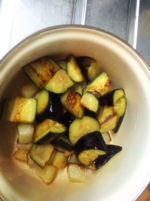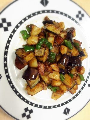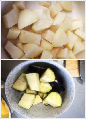 然后是炸茄子土豆,煎的也可以。炸到金黄色就可以了。土豆最好能软一点。我用煎的,炸的话太费油了,太奢侈了T_T