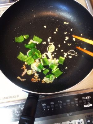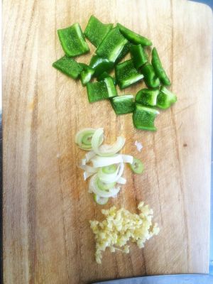 留着底油,把青椒,葱和一半的蒜末入锅,爆香。就在我忙着拍照的时候,我的蒜糊了,各位看官请不要在意这些细节,呵呵哒