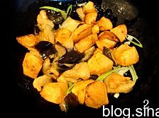 奶锅中放入多半植物油(用奶锅炸食物,锅小,节省面积和油)油温7成热时,放入茄子炸熟控去多余的油脂,土豆也放入油锅炸成金黄色捞出。
