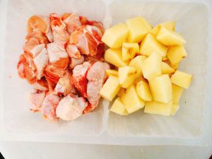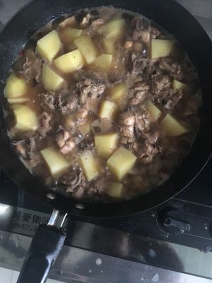 2.在锅里倒入油炒葱'蒜'姜'之后在把鸡块翻炒,在倒入土豆一起翻炒'炒到土豆熟了'在锅里倒入水'把味精'放点!