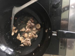 倒入适量油,将鸡肉煸炒一下,放入适量酱油,老抽,蚝油,胡椒面等调味料,继续煸炒均匀。之后加入开水煮沸。