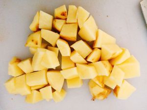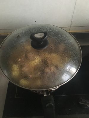 待沸腾后,加入三块冰糖,稍后,放入土豆,小火慢炖。
