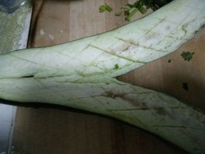茄子切开两半,割成图示