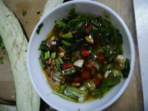 蒸茄子的过程中,将其它材料切末,锅里放油将蒜爆香,加入适量蚝油,生抽,盐,大冲椒。