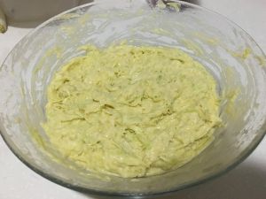 等南瓜冷却了,把糯米粉、玉米淀粉一起拌入南瓜里