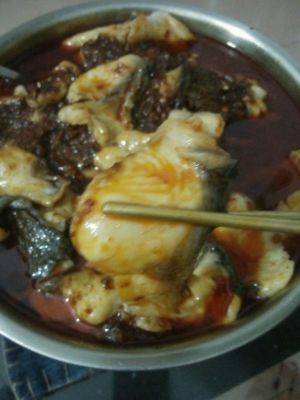 水和调料煮沸后,将鱼片加入锅里煮5分钟,然后把鱼片捞起,放入已准备好的熟蔬菜盆,这时可以将一小包成品调理包里的辣粉洒在熟鱼片上(我没有加,因为已经够味儿也辣了,如果特爱吃辣的就加一包)最后,把锅里的热料浇在整盆水煮鱼上