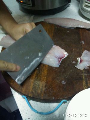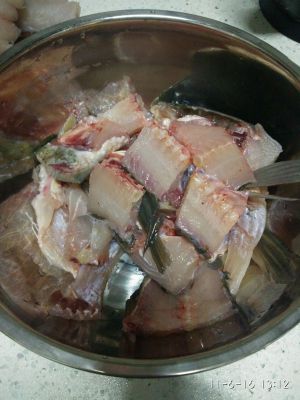 煮鱼骨 水沸腾后,先把鱼骨入锅煮5分钟