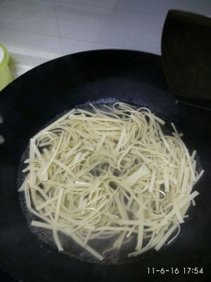 将冻豆腐、蘑菇、土豆片放盐水里煮熟捞起放置盆中
