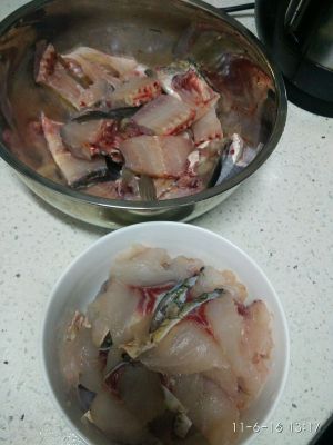 炸鱼骨 将鱼骨部分炸至微黄捞出备用