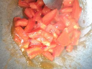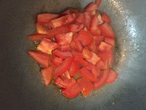 倒入番茄翻炒 知道有汁水出来 番茄变的糊糊的
