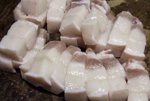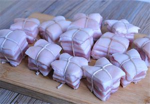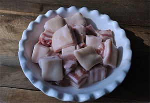 选好肉厚又宽的条纹非常漂亮的五花肉,温水洗干净切大块备用