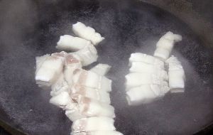 将五花肉焯水,捞起,晾干水备用,(主要去除肉的血水和气味)